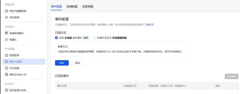 飞书的后台在保存配置前,会主动检查你的服务是否在线。如果连接没建立起来,它就会阻止保存,以防你配置了一个无法工作的回调地址 。