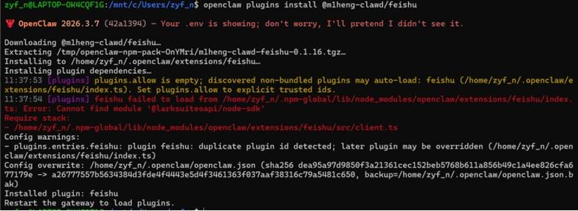 由于插件 ID 相同,OpenClaw 加载时会发生覆盖,可能导致飞书渠道无法正常初始化。从日志看,第三方插件安装过程有错误(error npm install failed、error plugin already exists),这个目录很可能是不完整的,从而干扰了正常插件的运行。