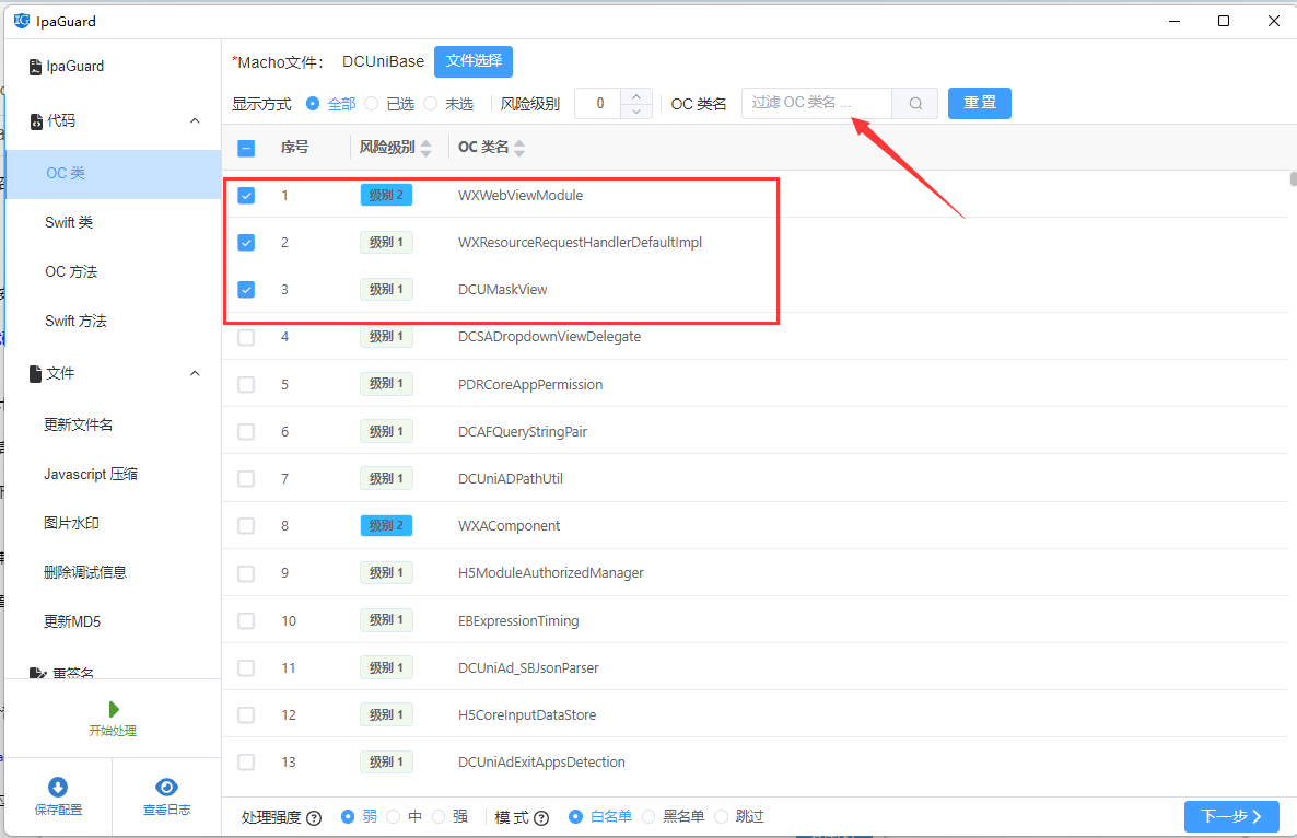 在 Ipa Guard 的资源模块中,可以选择需要处理的类型,例如: