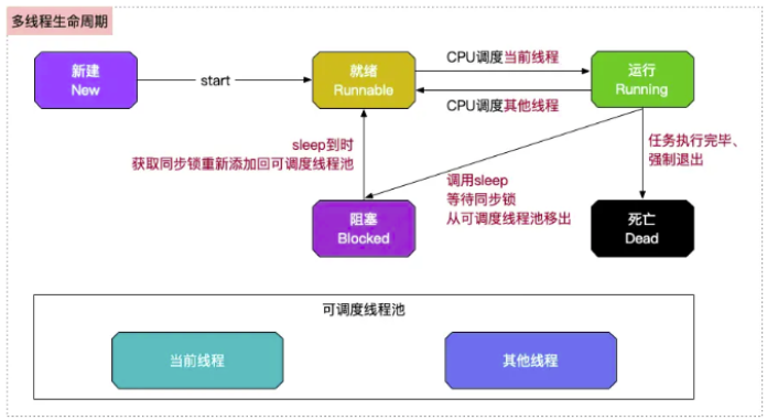 线程对象调用start方法将对象加入可调度线程池等待CPU调用