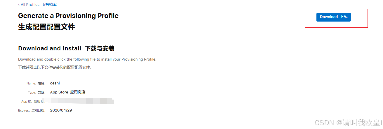 最后直接下载就行,如果没有配置过device设备的,可能在这一步之前还需要配置一下手机设备,下载成功后就是名称的xx.mobileprovision文件