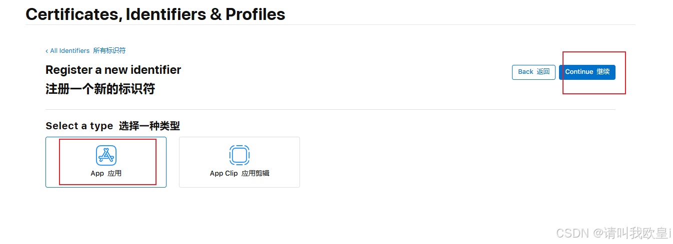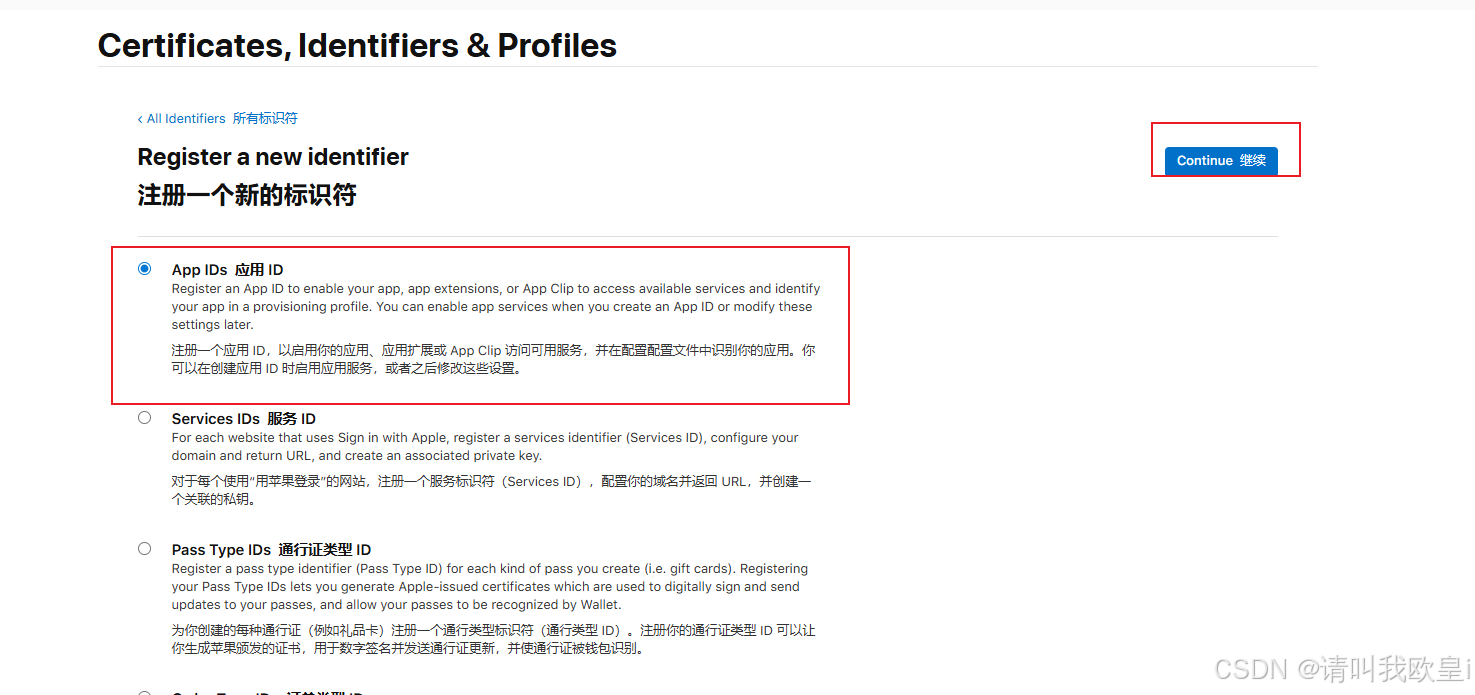 点击以下链接登录ios的开发者账户(window和mac都可以),以下链接是直达Identifiers标识符链接,登录成功后再次点击跳转即可,之后点击创建标识符