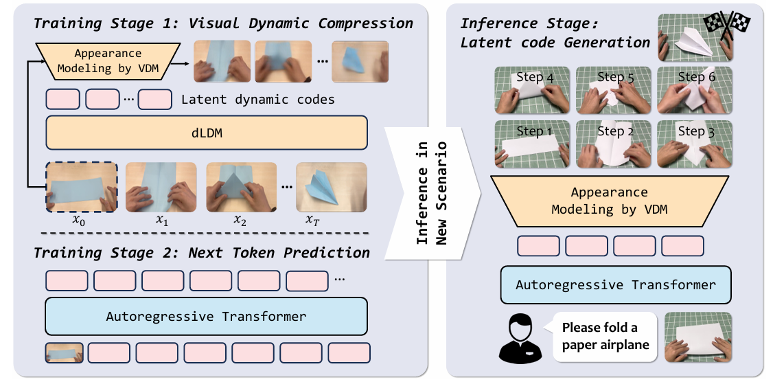 - 图3:VideoWorld 2 模型架构概述。(左)首先,动力学增强潜在动力学模型(dLDM)将未来的视觉变化压缩为紧凑且可泛化的潜在编码,随后由自回归Transformer对这些编码进行建模。(右)在推理阶段,Transformer根据输入图像为全新的未见过的环境预测潜在编码,这些编码后续会被解码为任务执行视频。