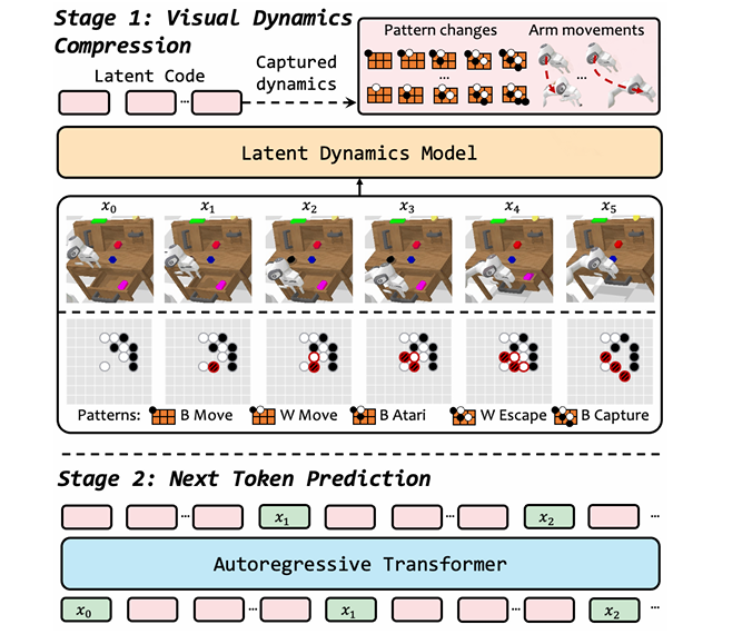 - 图3:所提出的 VideoWorld 模型架构概述。该架构的运作流程为:首先,潜在动力学模型(LDM)将每一帧至其后续帧的视觉变化压缩为一组潜在编码;随后,自回归变换器将潜在动力学模型的输出与下一个标记预测范式无缝融合。