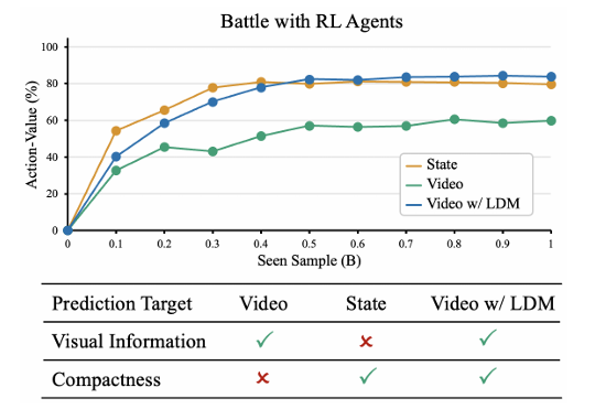 - 图 2 预测目标对比。"状态""视频" 和 "结合潜在动力学模型的视频" 代表三种不同的预测目标,分别为:状态序列(如围棋中带标注的落子位置)、原始视频序列,以及融合了表征未来视觉变化的潜在编码的视频序列(VideoWorld 模型采用的方案)。"动作价值" 指游戏中每一步落子的评分。将视频信息与视觉变化的紧凑表征相结合,能够实现更高效的模型学习。