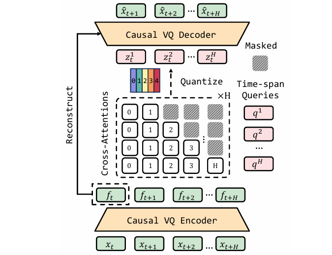 - 特征提取 :编码器因果地(causally)提取当前帧 xtx_txt 到未来 HHH 帧的特征图。为了保留时间细节,这一步不进行量化。