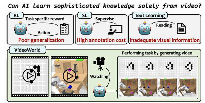 - 图 1 VideoWorld 模型探索从无标签视频中学习知识,所学知识涵盖特定任务的规则,乃至高级的推理与规划能力。与强化学习(RL)、监督学习(SL)和基于文本的学习这三类主流学习方法相比,该模型具备三大优势:1)通过适配各类任务与交互界面的统一视觉表征,实现更优的泛化性能;2)大幅降低人工标注的工作量;3)相比文本描述的方式,能习得更丰富的现实世界信息。