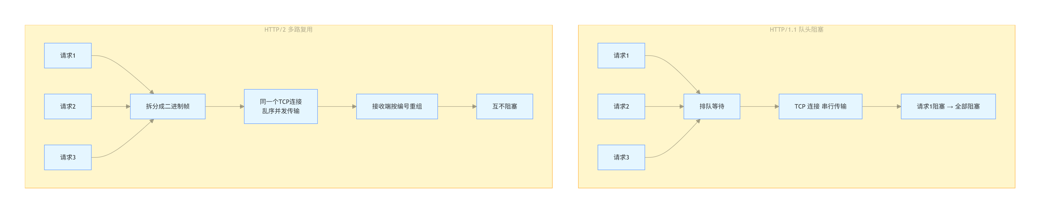 | 多路复用 | 彻底解决 HTTP 层队头阻塞,单 TCP 连接并发多请求。多路复用很好的解决了浏览器限制同一个域名下的请求数量的问题,同时也更容易实现全速传输。 | 多请求的帧可乱序传输,接收端按帧编号重组,无需排队 |