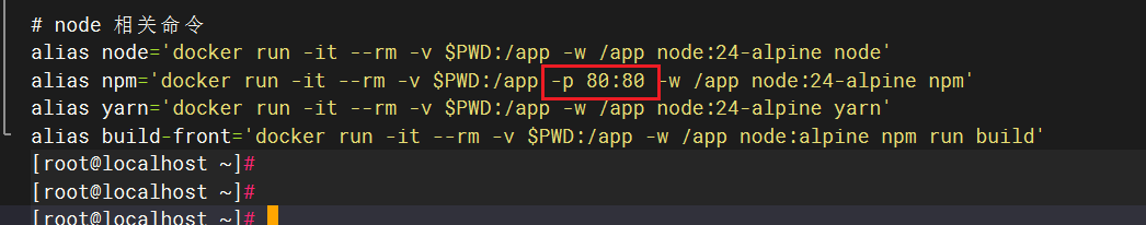 alias npm='docker run -it --rm -v $PWD:/app -w /app node:24-alpine npm'