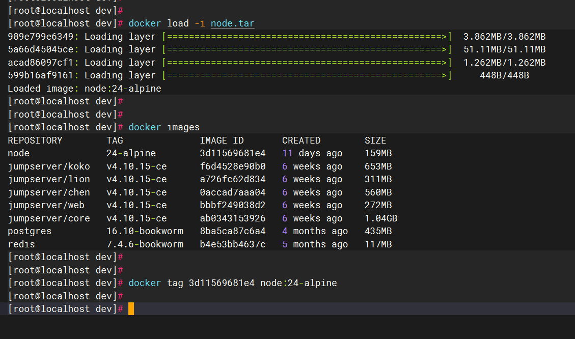 拉取 docker 镜像,以 node:24-alpine 为例,我在 windows 本地拉取了这个镜像,然后打成一个 tar 包。