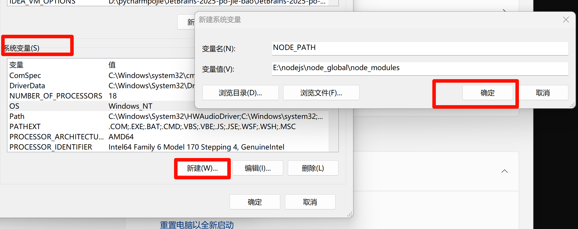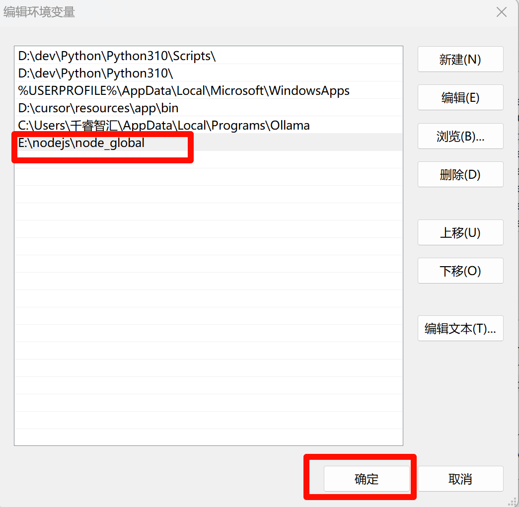 将默认的 C:\Users\你的用户名\AppData\Roaming\npm 路径修改为 node_global 文件夹的路径(如 E:\nodejs\node_global),然后点击确定。