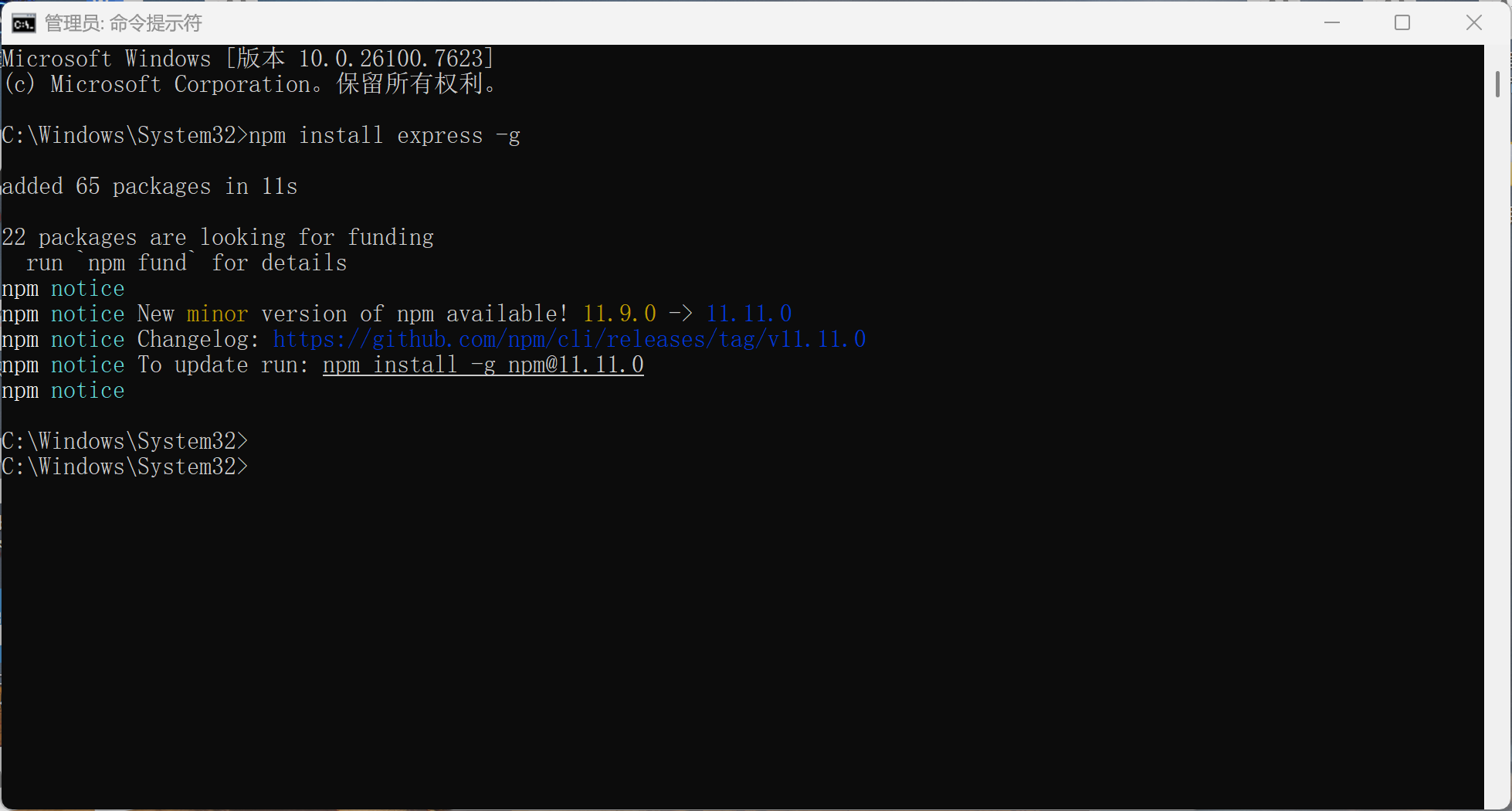 全局安装 express 模块(以管理员身份运行 CMD)