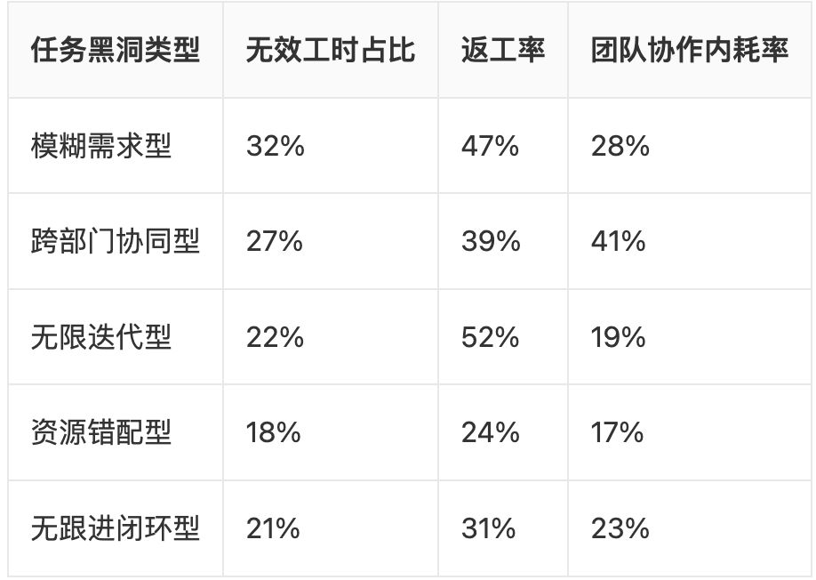 不难发现,模糊需求型和跨部门协同型任务带来的无效工时和内耗率最高,是企业需要优先破解的核心黑洞类型。
