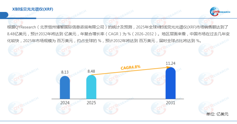 QYResearch调研显示,2025年全球X射线荧光光谱仪(XRF)市场规模大约为8.48亿美元,预计2032年将达到11.73亿美元,2026-2032期间年复合增长率(CAGR)为4.8%。