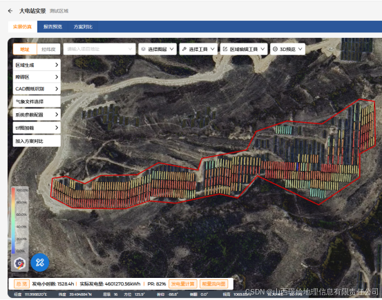 这就是光伏发电的一个现实的应用,基于地形数据和既有的光资源数据对场景进行模拟计算,进而求得所选区域的光伏电站的基本情况,本次的模拟可作为项目的初步选址及发电量的一个估算,后期的施工图及详细设计需要专业的团队进行计算