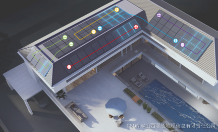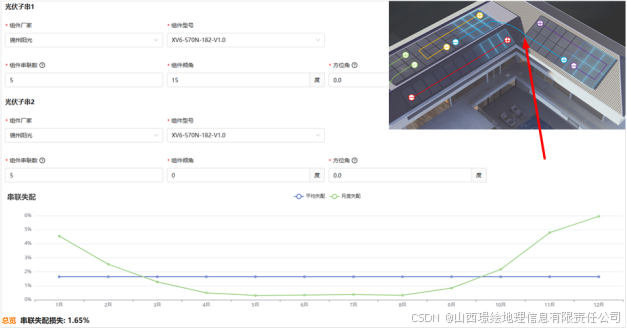 跨屋面串接后,将会大大增加串联失配损失,此时在进行失配建模时则应单独 考虑每个组件的 U-I 特性,并对每个组件 U-I 曲线进行叠加计算,生成新的 U-I 曲线 。依据此原理可计算出跨接造成的失配损失,并根据失配损失限制跨接数量,过大的失配损失可考虑不跨接或少跨接。跨接的组串,在接入逆变器时,要接入单独的MPPT端口,以减少并联失配损失。借助iSolarSim 光伏发电仿真软件 计算得知,图中某串线形式下,在同区域采用同款组件情况下,不同倾角造成的串联失配损失约1.65%。