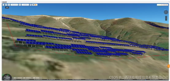 本系统基于DEM数据就可以分析,只不过公开数据的DEM数据分辨率比较低,12.5m算是公开的最高分辨率的数据了,如果使用实际测绘的数据生成DEM数据效果估计会有很大的提高,且外业调查测绘可以标注一些地表的覆盖数据及建筑物及构筑物,对设计也是有很强的辅助作用,这也许就是目前测绘在设计中最大的作用了,且测绘的数据可以生成项目区域的OSGB格式的三维实景模型,对排布的光伏板区域可以进行图上的核验,提高设计的可利用率。