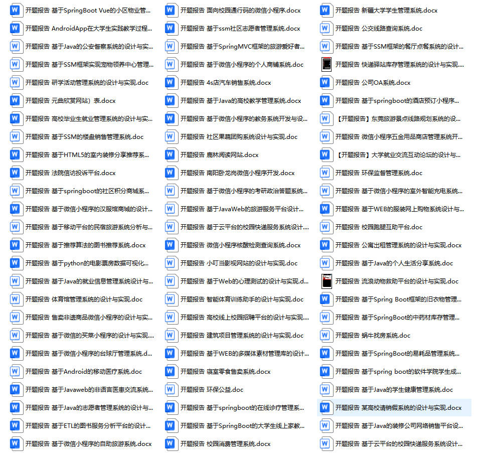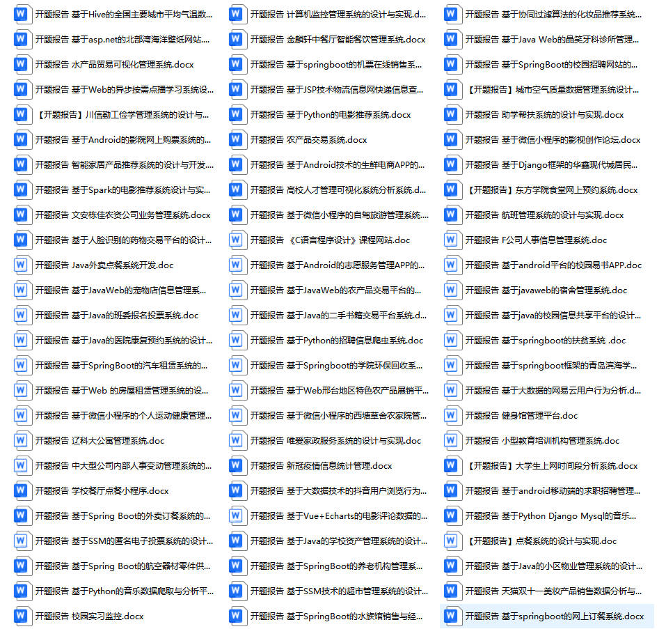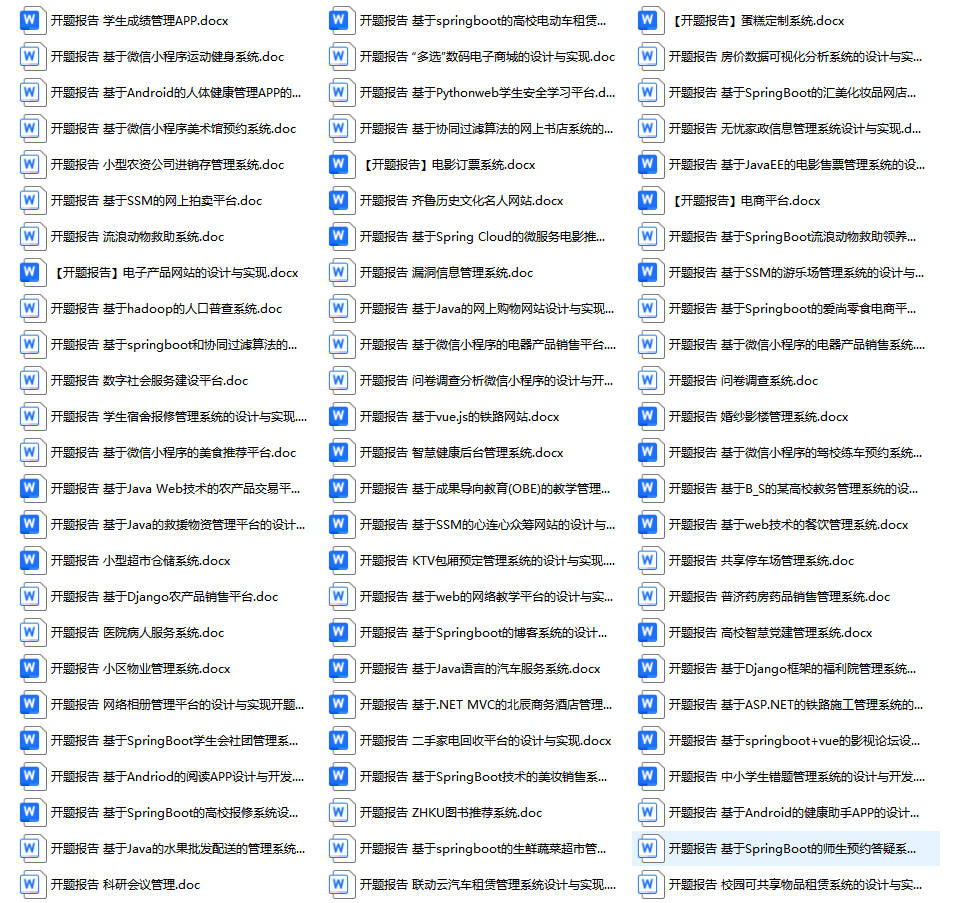 以上是某同学的毕业设计答辩的过程,如果你现在还没有参加答辩,还是开题阶段,已经选好了题目不知道怎么写开题报告,可以下面找找有没有自己符合自己题目的开题报告内容,列表中的开题报告都是往届真实的开题报告,可发送使用或参考。文末或底部来联xi可免费获取