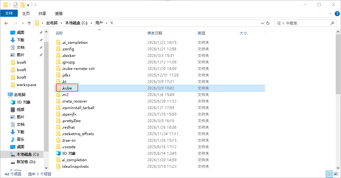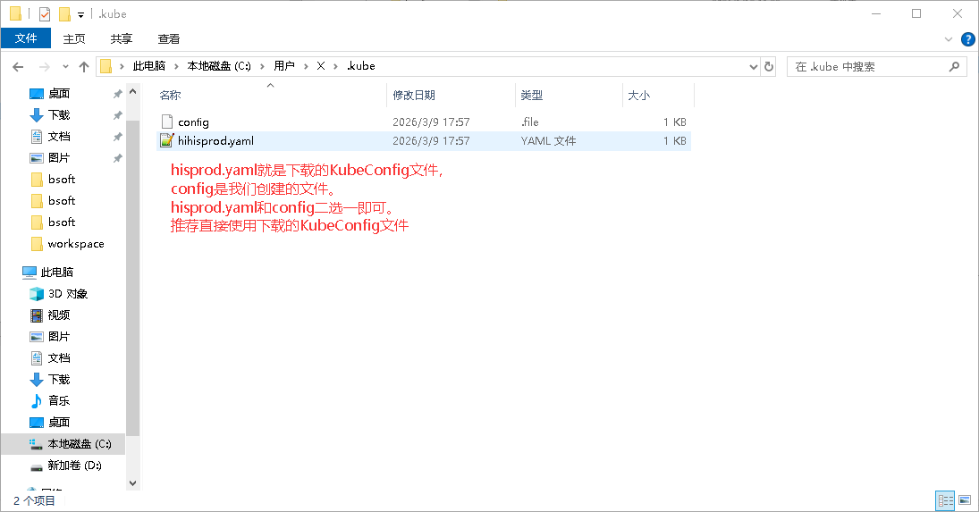 亦或是把你下载的KubeConfig放到.kube目录下,如下所示: