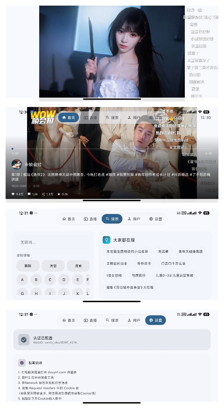 myDV TV版是借助AI技术开发的抖音第三方客户端,专为电视遥控器操作设计的大屏版抖音。该应用具备刷视频、观看关注的直播以及搜索这三大功能,用户仅需通过简单的遥控器操作,就能在电视大屏上畅享刷抖音的乐趣。比如通过上下键浏览视频,在首页按确定键可显示或隐藏视频详情,长按菜单键能弹出如弹幕开关、分辨率切换、倍速播放和查看主页等选项,左右键可调整视频进度,返回键能回到导航栏。需留意,因抖音未开放公开API,用户登录时需填写从抖音网页端获取的Cookie才能完成登录操作。登录需要配置cookie:在浏览器登录网页版抖音,按"F12"打开开发者选项,点开网络选项卡,刷新网页,点开随便一个请求,找到cookies复制。