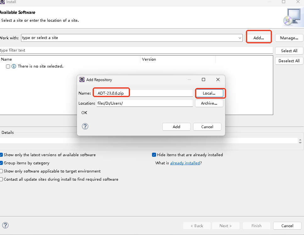 在弹出的窗体点击add添加压缩包的路径,添加后name下会显示Developer Tools,选中Developer Tools,去掉最后一行的√,然后一路next,最后finish。
