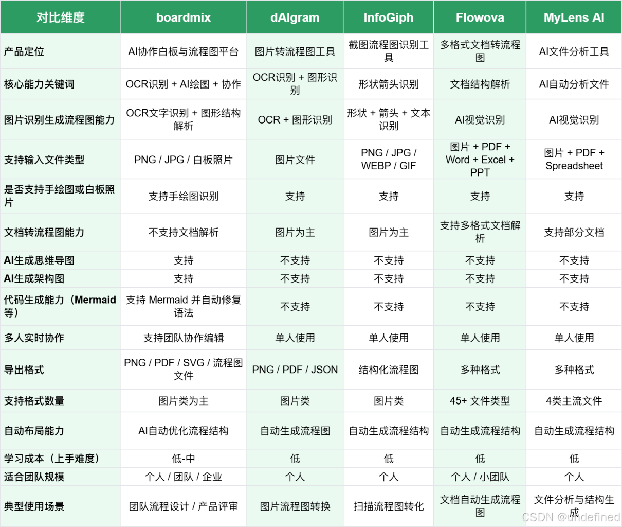 这5款AI流程图工具代表了当前AI流程图生成领域的两条主要技术路径:图像识别路径(boardmix、dAIgram、InfoGiph)和文档解析路径(Flowova、MyLens AI)。