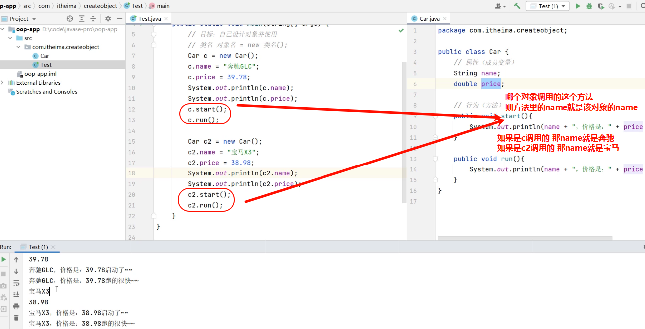为了让有参构造器的形参名可以做到见名知义 this就派上用场了右边的name:确实接收到了奔驰 但它是Car方法里的局部变量