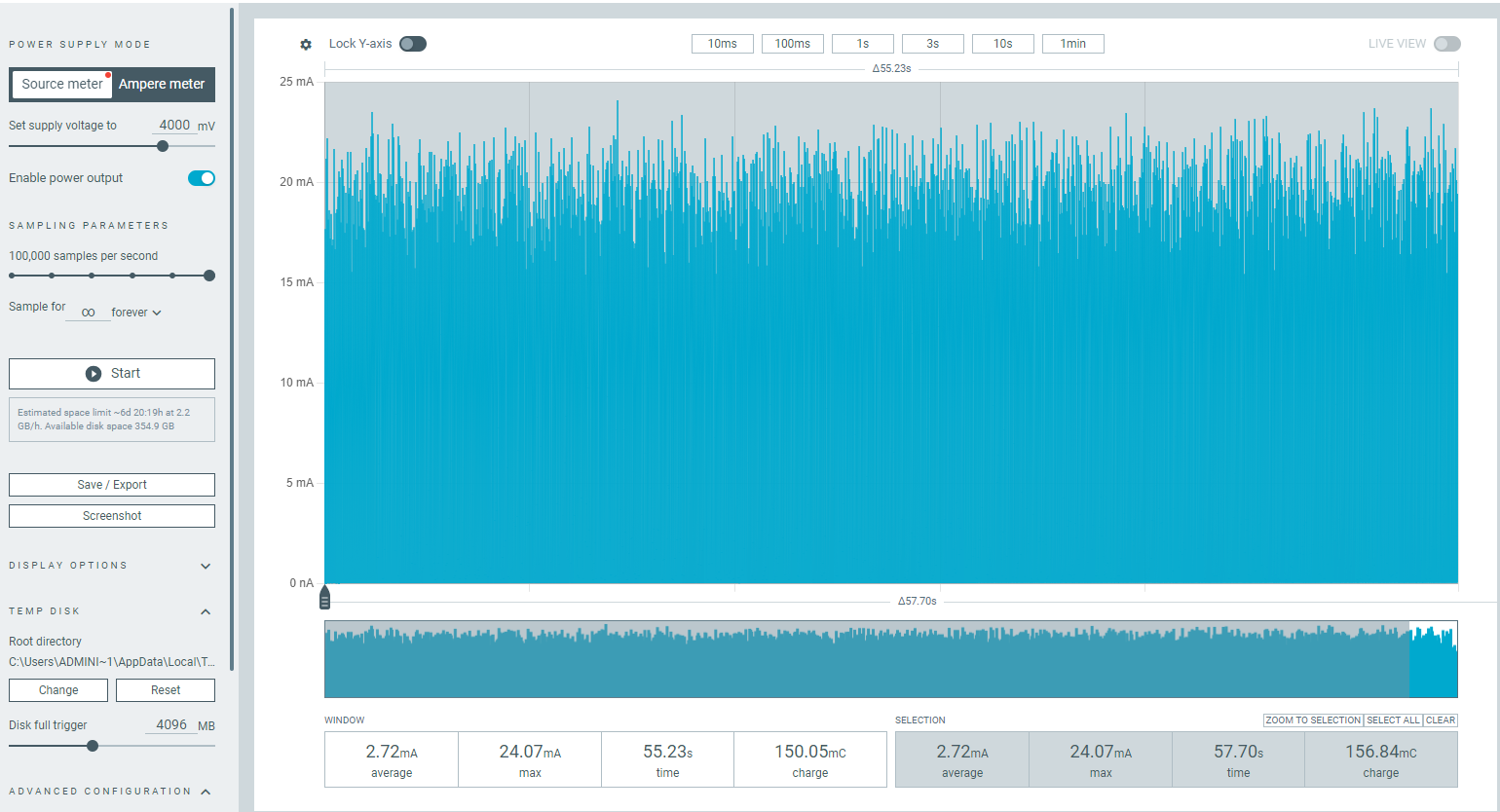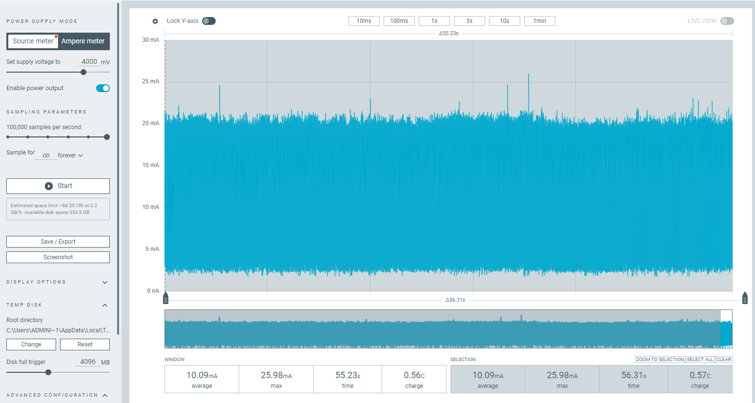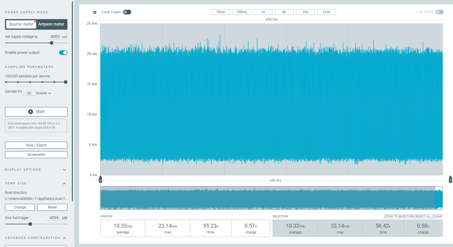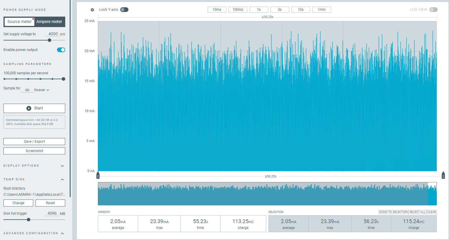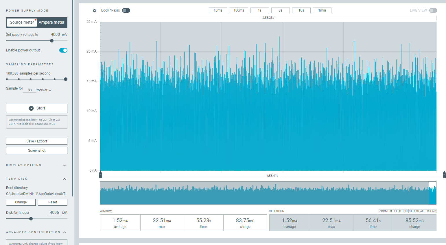 测试方法:将功耗仪替换电池供电,制作了一个电池的端子替换电池,然后将另一端接入功耗仪供电,测试电压4V。不停转动数鼠标60S。