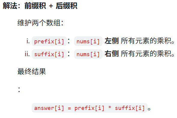 answer[i]*=suffix; 计算后缀积才是*=,因为answer[i] = prefix[i] * suffix[i],在原来计算好的前缀积的基础上再乘以后缀积。