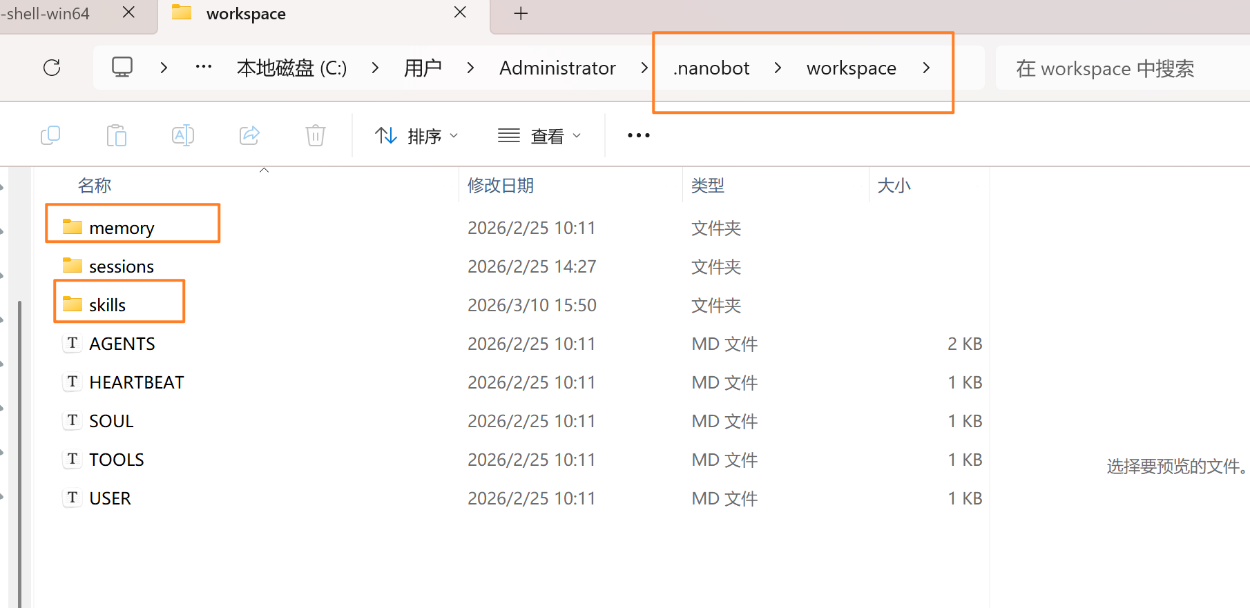 nanobot的memory和skills存储在下面的目录:如果你要扩展其他地方的skills,直接放到下面的skills目录下。后面会放入agent-browser的skills,用于操作浏览器自动化。