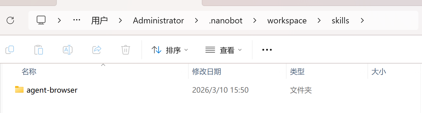 将下载的agent-browser目录复制到C:\Users\Administrator.nanobot\workspace\skills目录下。(根据你的.nanobot调整)