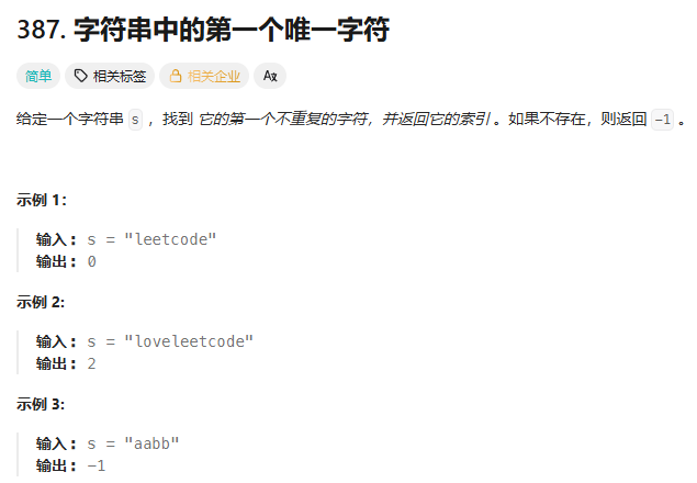 例题:https://leetcode.cn/problems/first-unique-character-in-a-string