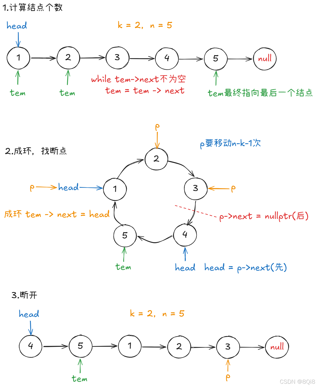 n - k - 1步(n是链表长度),找到新的尾部。 - 最后断开 :把新尾部的