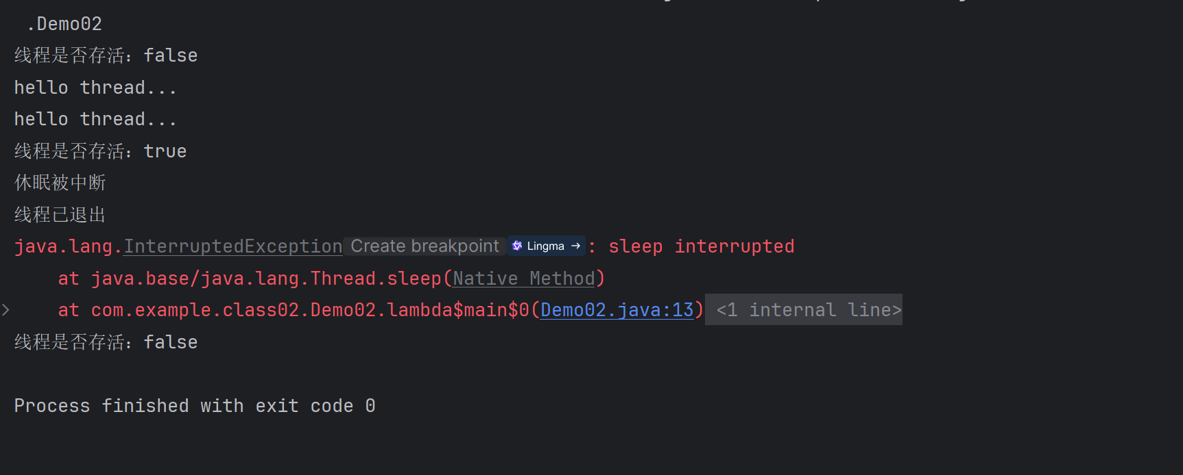 运行结果中hello thread...会一直打印下去,原因是因为子线程大部分在休眠,这就导致thread.interrupt()让子线程从sleep中醒了过来,抛出InterruptedException。而JVM在抛出异常时,会自动清除中断标志位(也就是设置为false),这样就使!Thread.currentThread().isInterrupted()变成了true,并且catch 块里只打印了异常,没有做任何退出操作;这就导致会一直循环下去。