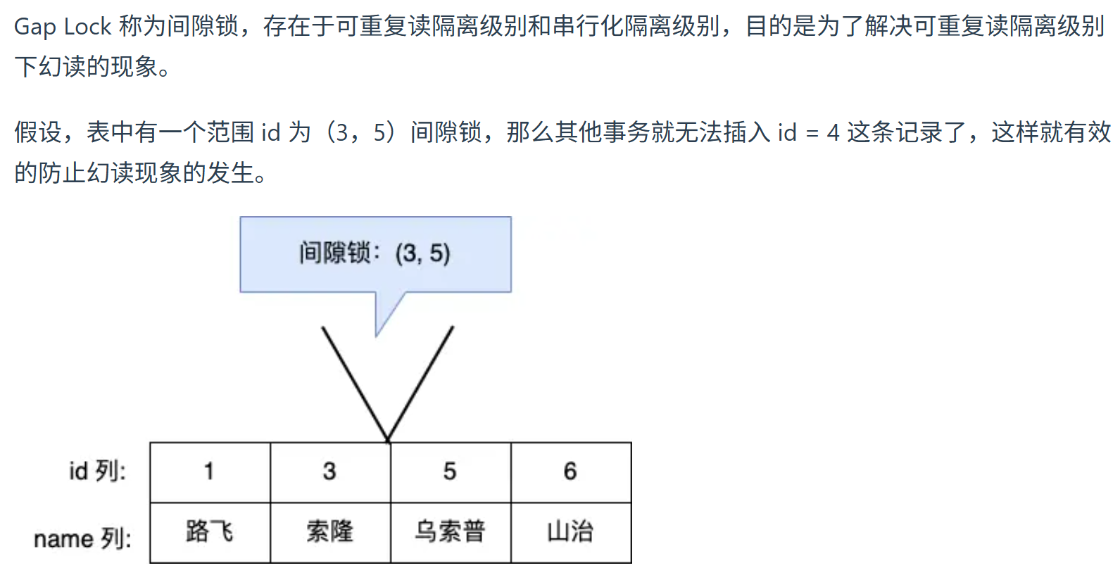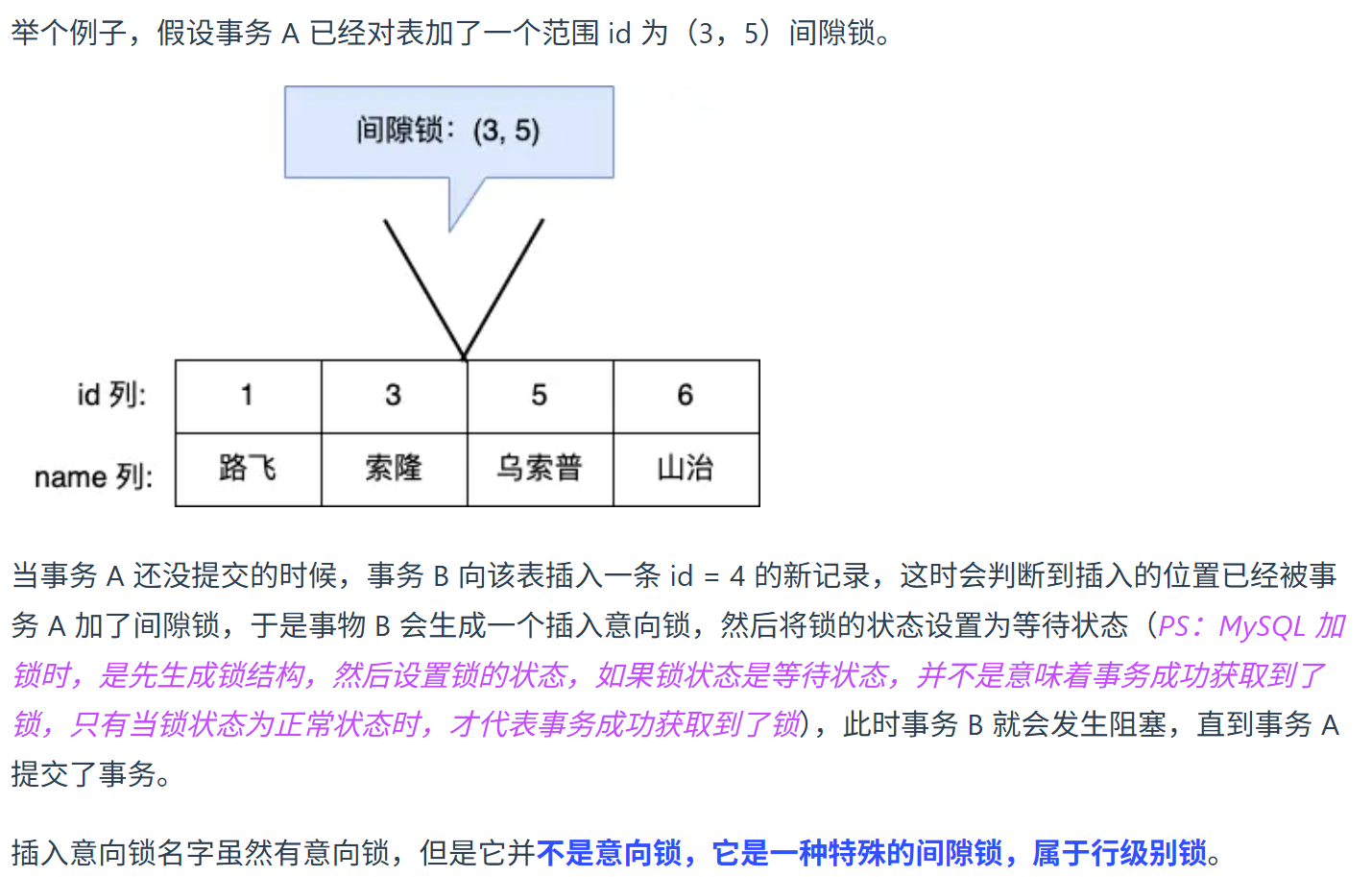 前面的意向锁,你要插入一行,意向锁会对这个表做标记,告诉数据库这个表现在有人在用,就不需要一行行地去扫描了。插入意向锁不是意向锁。下面是一个例子。