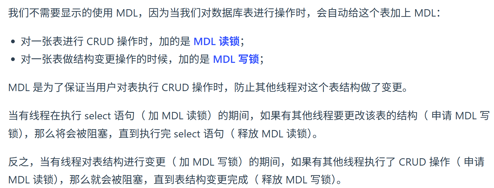 元数据锁也称 MDL 锁,我们不需要显式地调用 MDL 锁,因为操作数据库的时候会自动加上 MDL 锁。MDL 锁分为读锁和写锁。MDL 读锁就是在增删改查的时候,不允许其他线程读。MDL 写锁就是在对表进行修改时,不允许其他线程读。