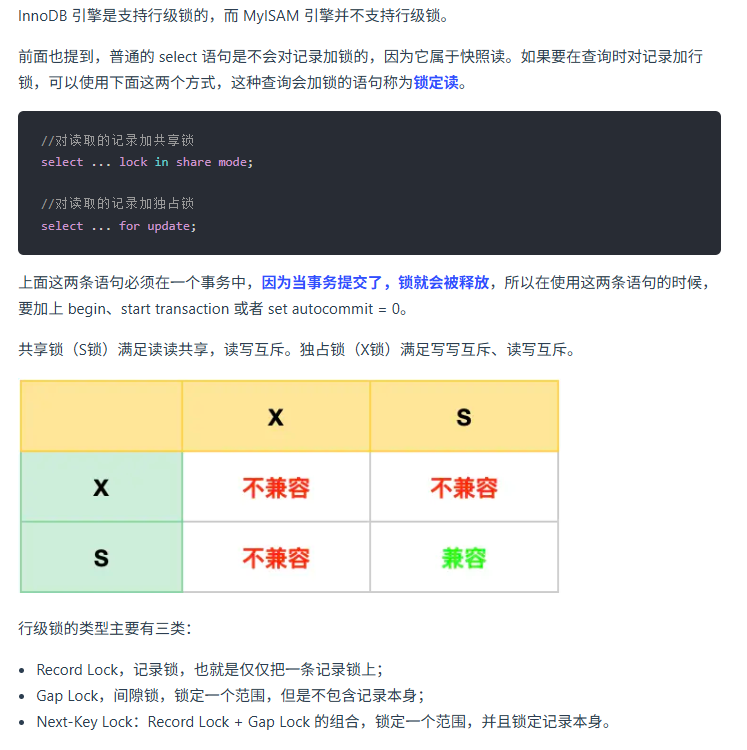幻读就是读了两次数据库,前后数据多了或者少了。 MySQL 中解决幻读的方法有两个:第一个是通过 MVCC 的快照机制,采用可重复读级别,在事务开始前获得一个快照,后面一直用这个快照。第二个是通过Next-key lock,让你根本没办法插进去新的数据。