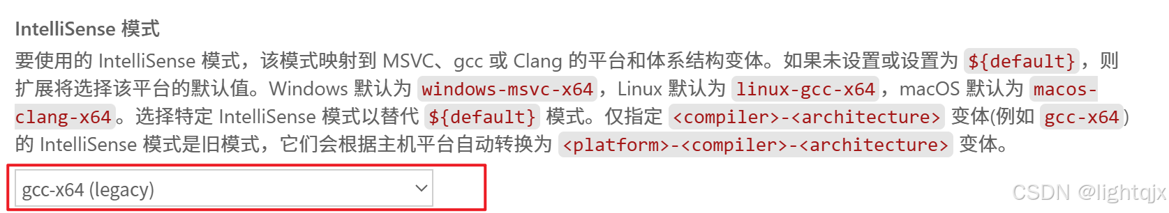 然后将代码提示的模式选择:gcc-x64(legacy) ,如图所示: