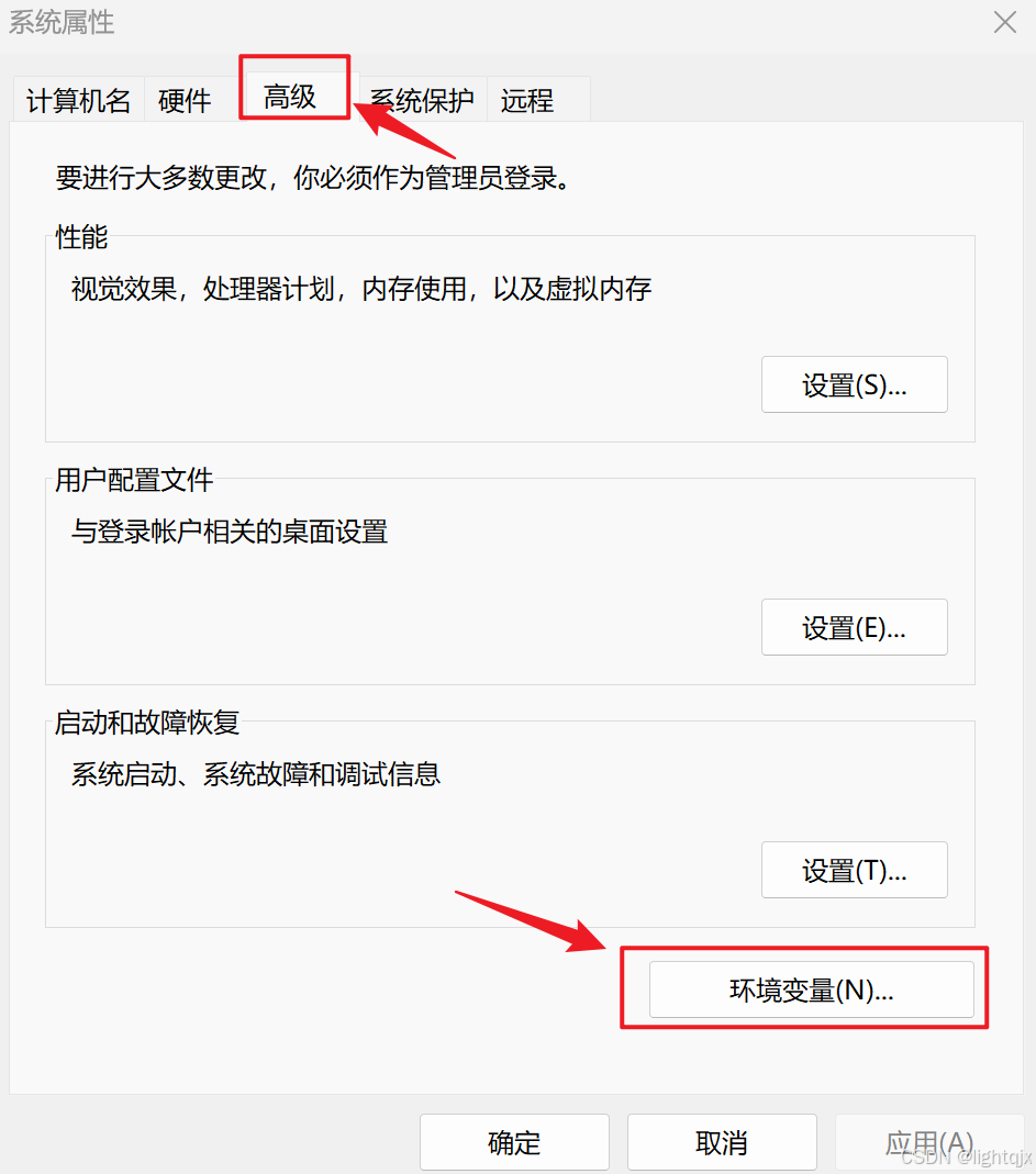 当然也可以在设置中去搜索,两种方法都是一样的。然后点击它,得到如下界面,在其中选择【】高级】中的【环境变量(N)...】,如图所示: