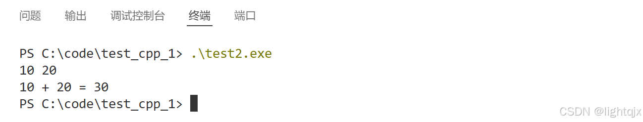通过键盘的Ctrl + ` 快捷键,可以打开VS Code自带的终端,输入 .\add.exe 即可完成运行。如图所示: