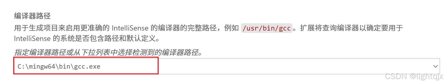 然后再C/C++的配置设置将编译器路径选择为:C:\mingw64\bin\gcc.exe ,如图所示:
