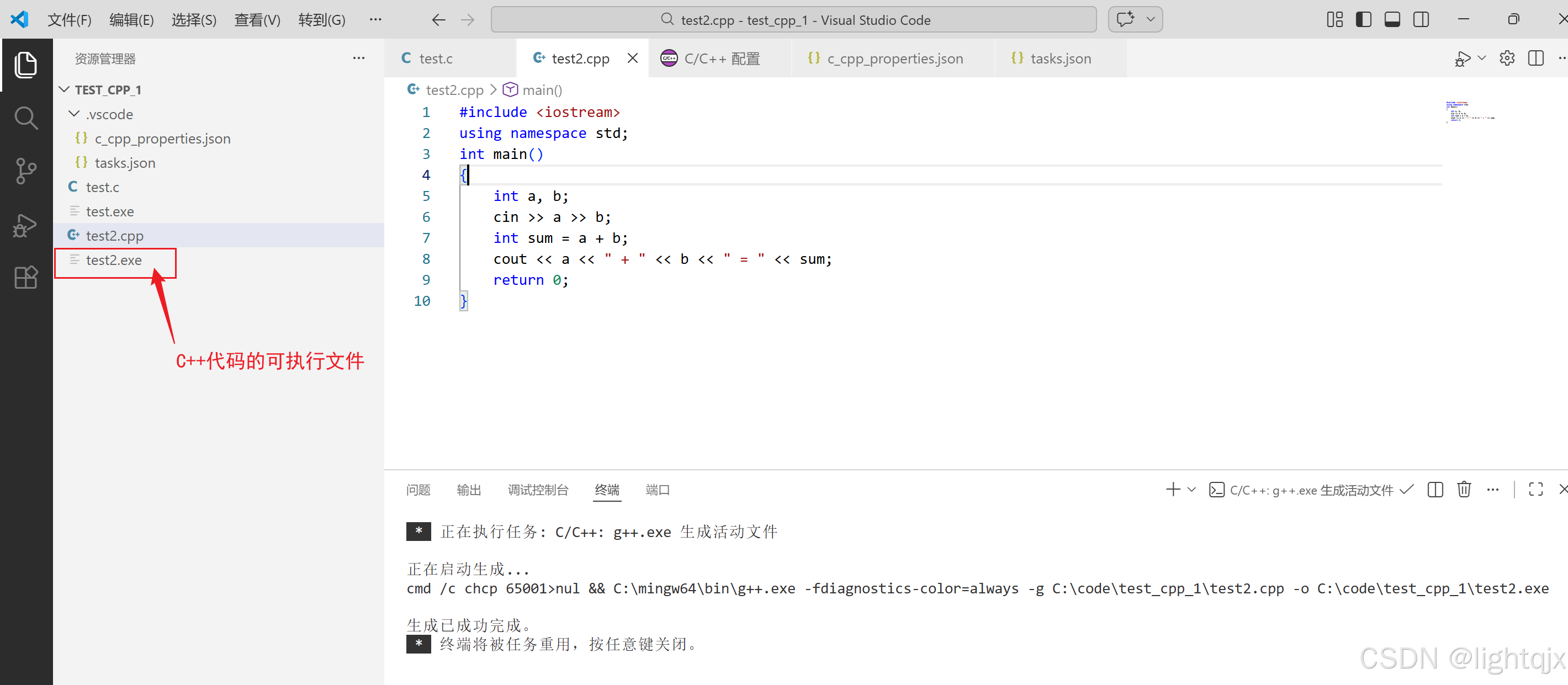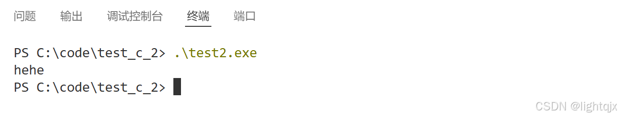 然后再使用键盘的Ctrl + ` 快捷键,打开终端,输入 .\test2.exe 就可以直接运行对应代码,如图所示: