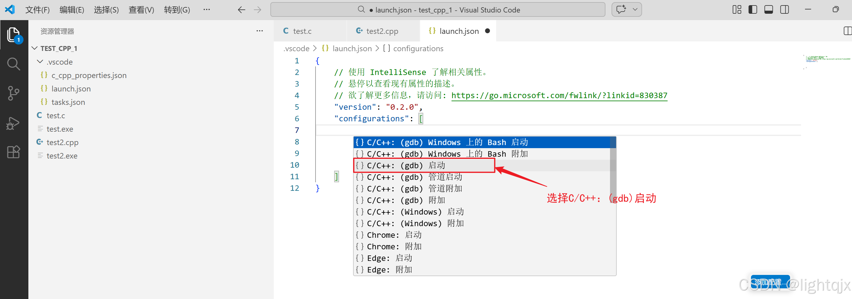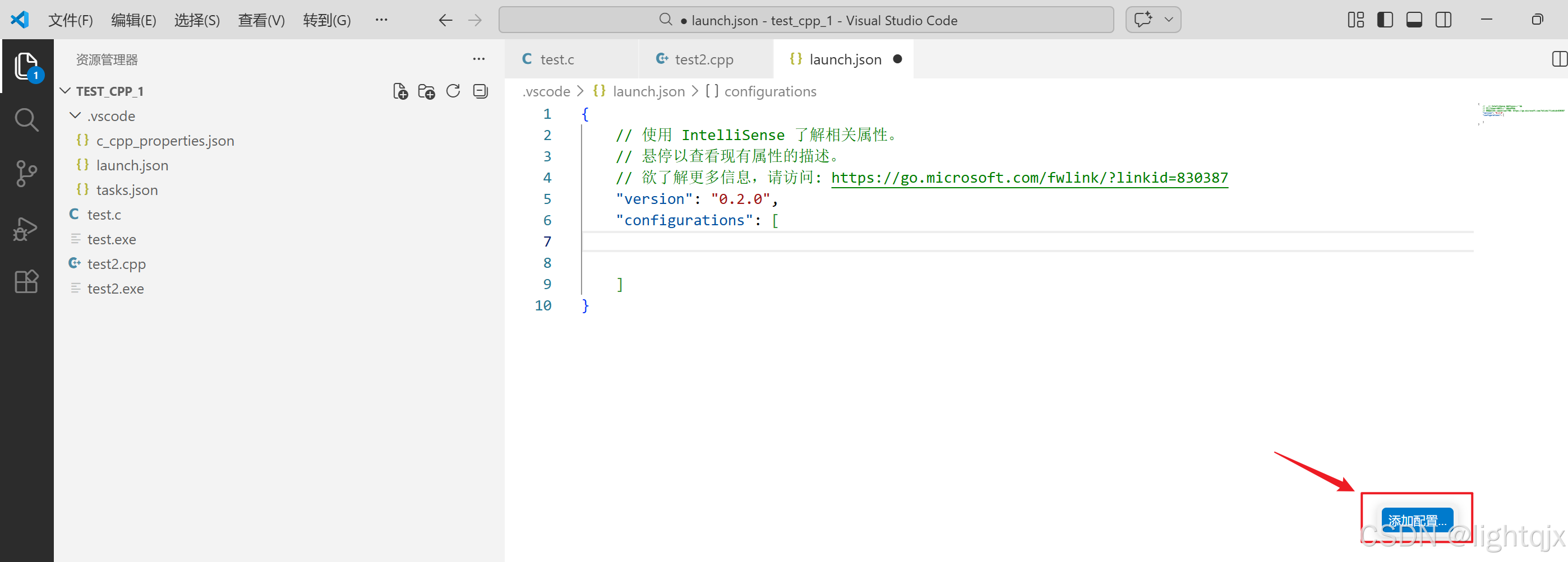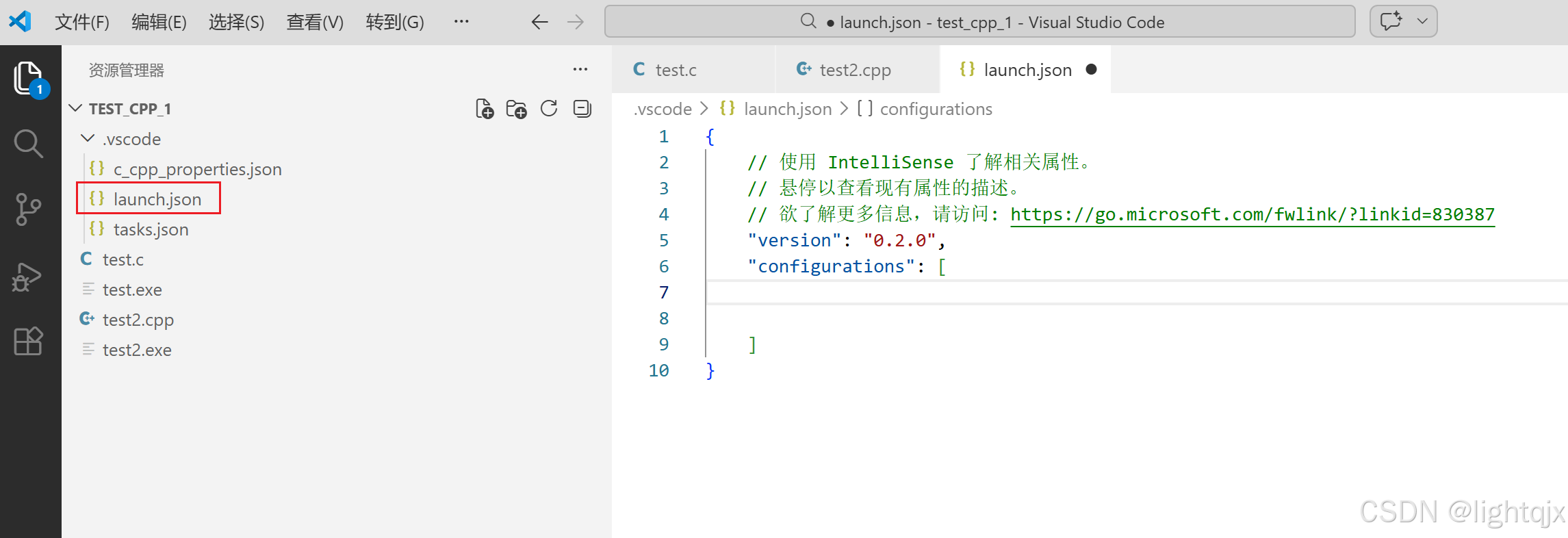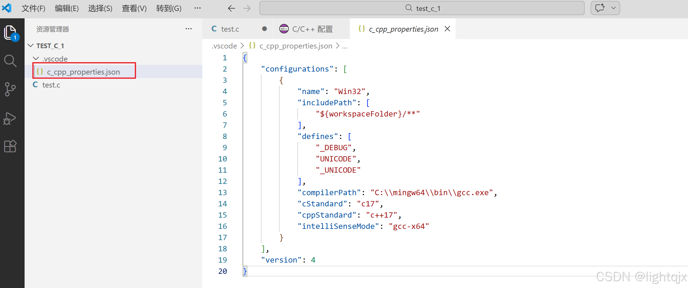 配置好后,在我们的TEST_C_1的文件夹下会默认生成一个.vscode的文件夹,在这个文件夹下又有一个叫c_cpp_properties.json的文件,c_cpp_properties.json的文件内容如下所示: