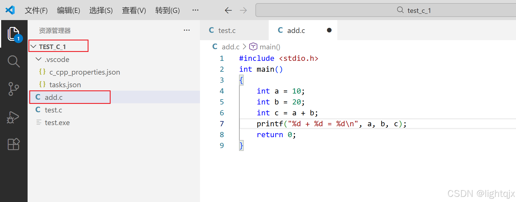 此时我们再将test_c_1中的.vscode文件拷贝到test_c_2中去,再使用VS Code来写代码,如图所示: