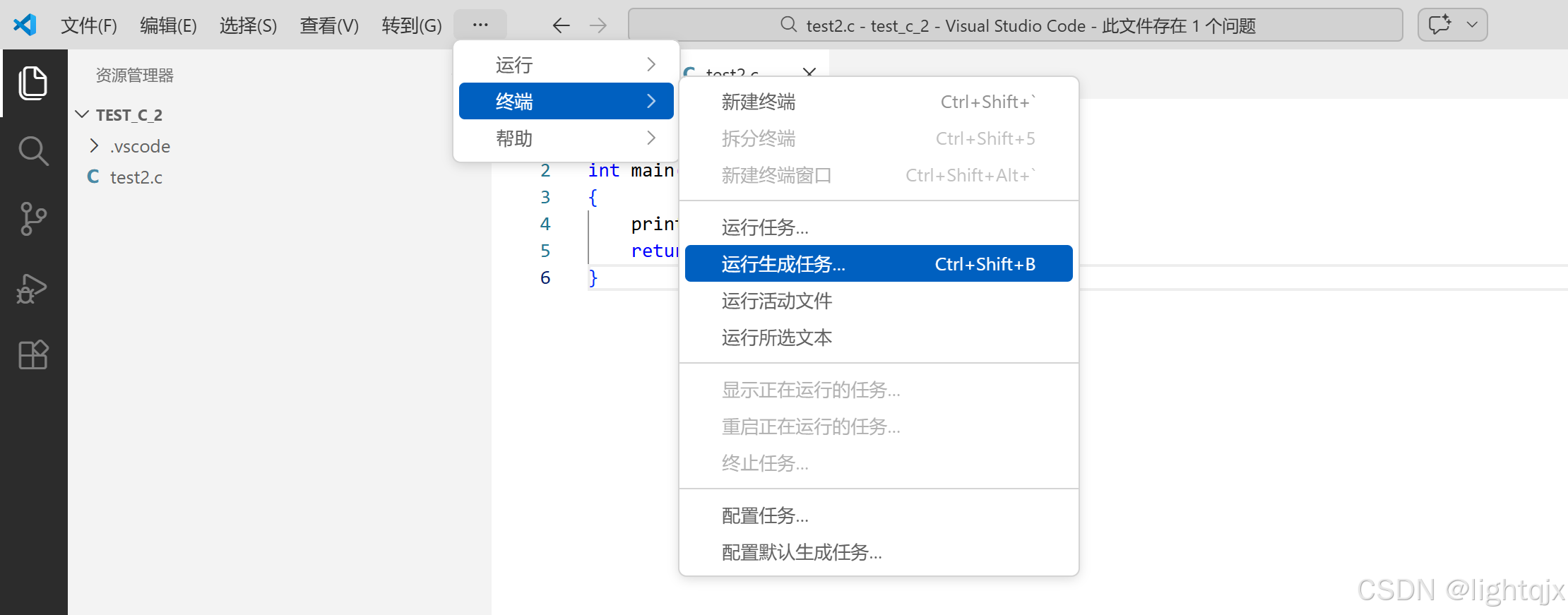然后我们就可以直接点击【终端】中的【运行生成任务】,进行编译了,如图所示:
