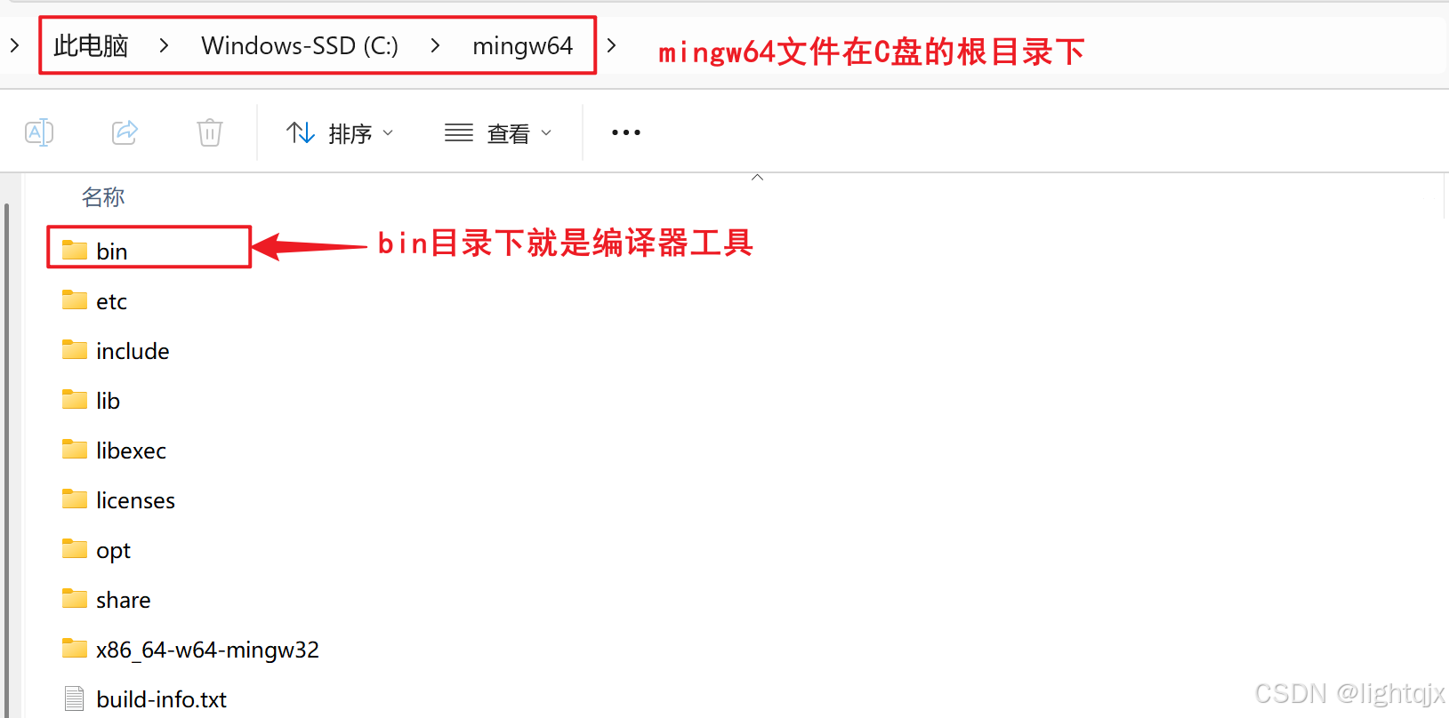 这个mingw64文件我们需要将它放在一个容易管理的路径上,建议直接放在C盘活D盘的根目录下,这里我直接放在C盘下,如图所示: