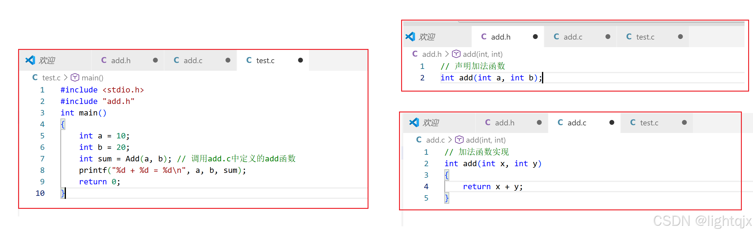 然后使用VS Code写一个工程中的多个.c文件,如下所示: