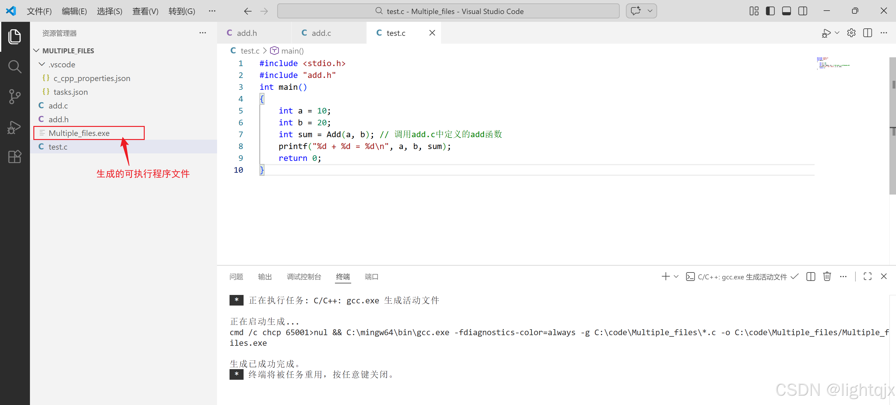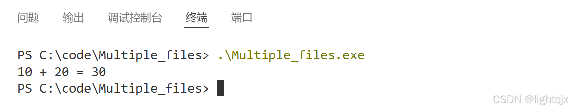 然后重新打开VS Code终端,执行 .\Multiple_files.exe来运行对应的代码,如下所示: