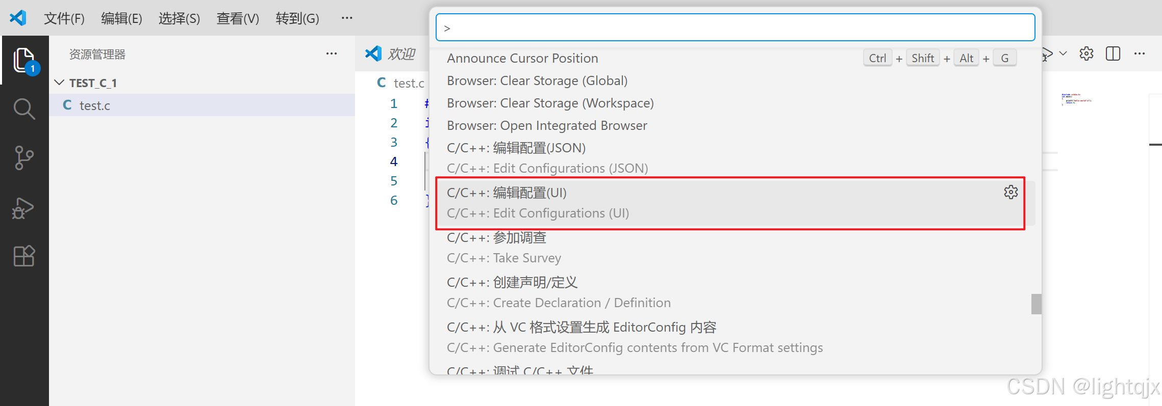 首先鼠标点在需要编译的.c文件的内部 ,然后点击Ctrl + Shift + p 快捷键,然后再弹出的界面上选择【C/C++编译配置(UI)】(需要找一下),如图所示:
