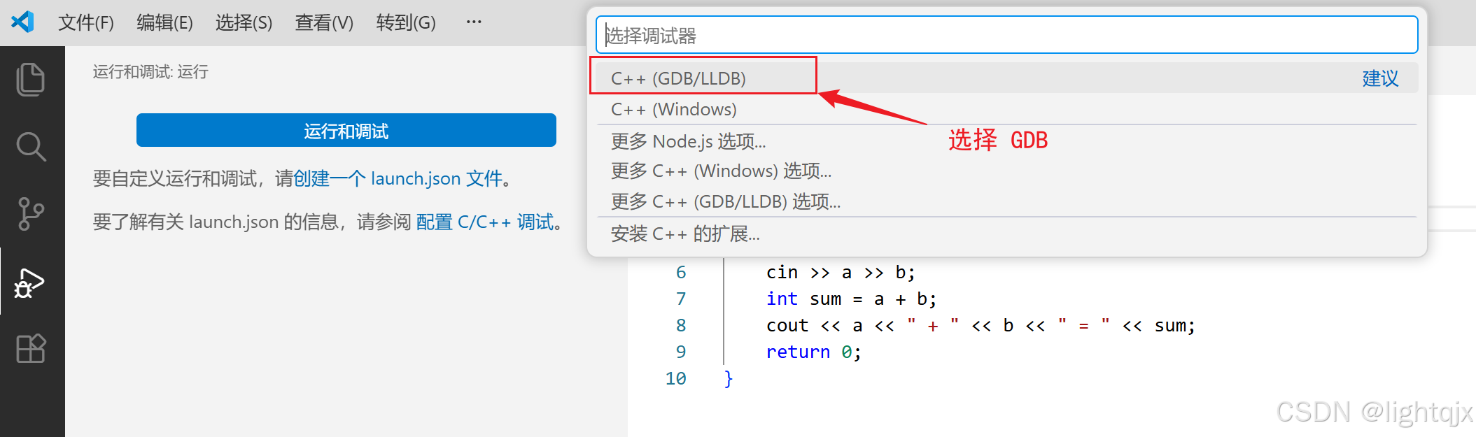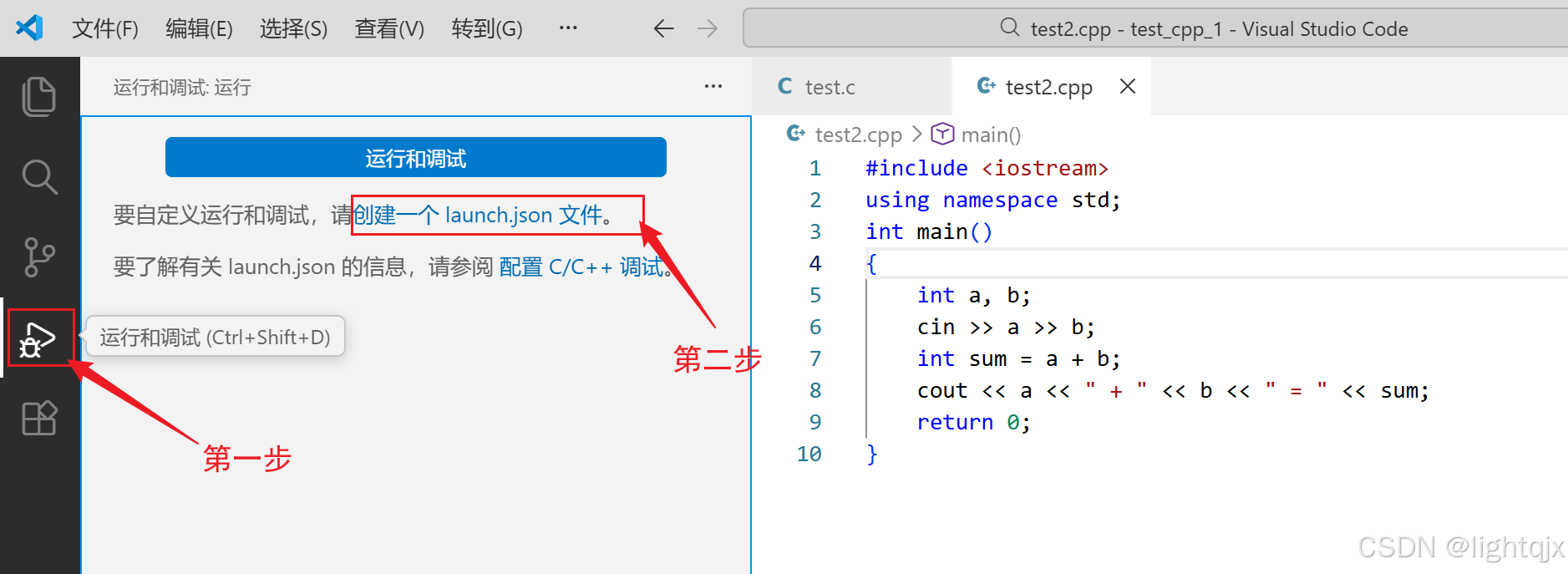 首先在VS Code中的点击运行和调试按钮,在点击创建一个 launch.json 文件,如图所示: